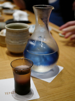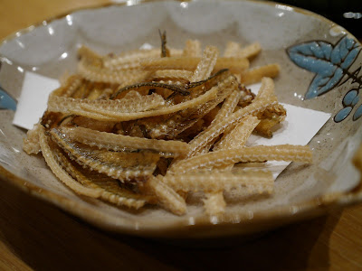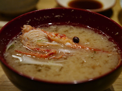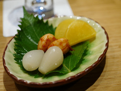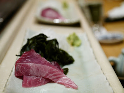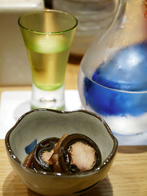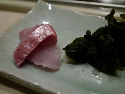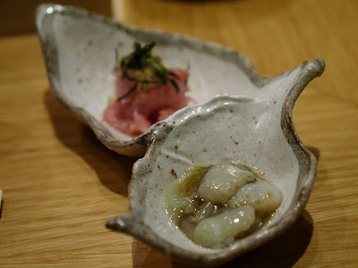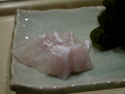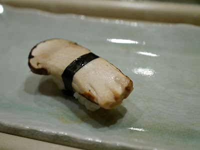 再以刺身揭開是夜序幕。左口魚,前面兩小塊是魚背(緣側),即連接背鰭和臀鰭間的肌肉,肉質緊實有嚼勁。左口魚肉本身魚味不濃,而在「天膳」午市和晚市吃到的左口咀嚼時都覺水份都較多,我會愛較爽口的質感。而魚肉厚度比以前在「見城」吃到那薄至半透明的比,這明顯較厚身。