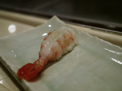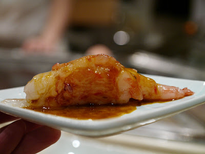 海膽壽司,根室產的海謄,帶橙色,黏稠甘滑不帶一點苦澀。洒一點岩鹽顆粒在面,更帶出海膽的甘甜。我想,和吃西瓜時洒點鹽在瓜肉上同一道理罷?!