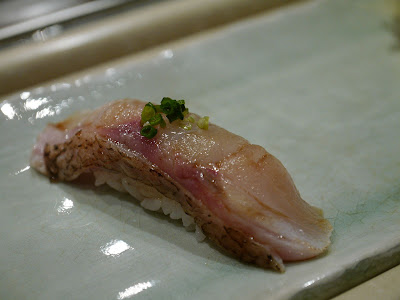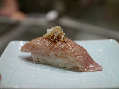 赤鯥壽司,魚肉油脂豐富,以火輕炙表面,入口更甘香。鬆軟的魚肉入口輕嚼便溶化,魚脂甘香也慢慢滲出充滿口腔。