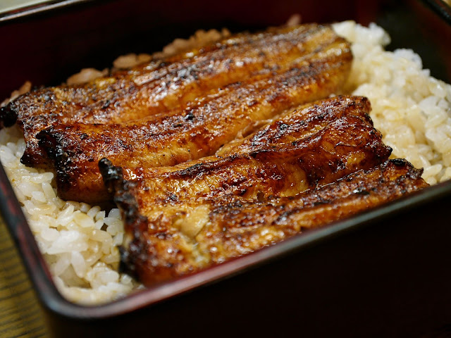 其實午餐還未消化,不餓的我點了小號的鰻魚飯(鰻重(上),1700 円)。我一進內坐下,師傅便請鄰座的女士(她會說一點華語和英語)翻譯,對我說那天沒位子給我,不好意思。待客有道,已令人心生好感。師傅先奉上一顆跳躍的鰻魚心,鄰座的女士說這生的鰻魚心有益健康(good for your health),不過味道有點苦,建議我和著飲品吞下。
